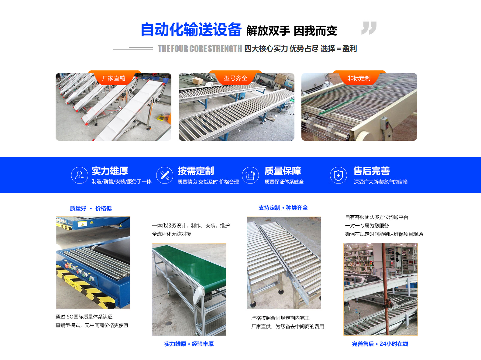 主要产品:皮带输送机、滚筒输送机、链板输送机、链网输送机、提升机、万向球平台